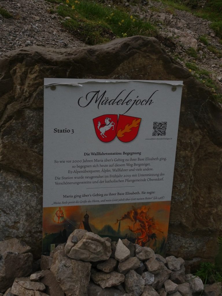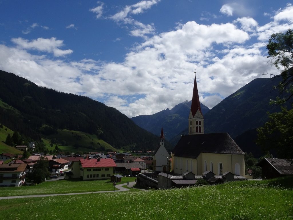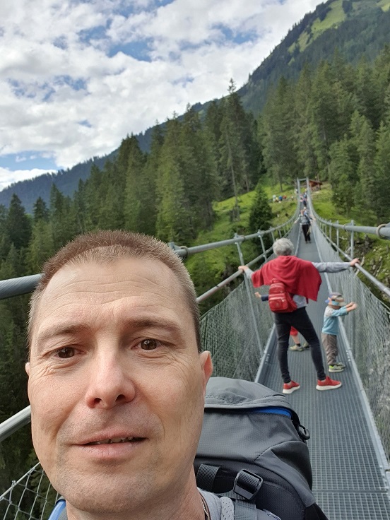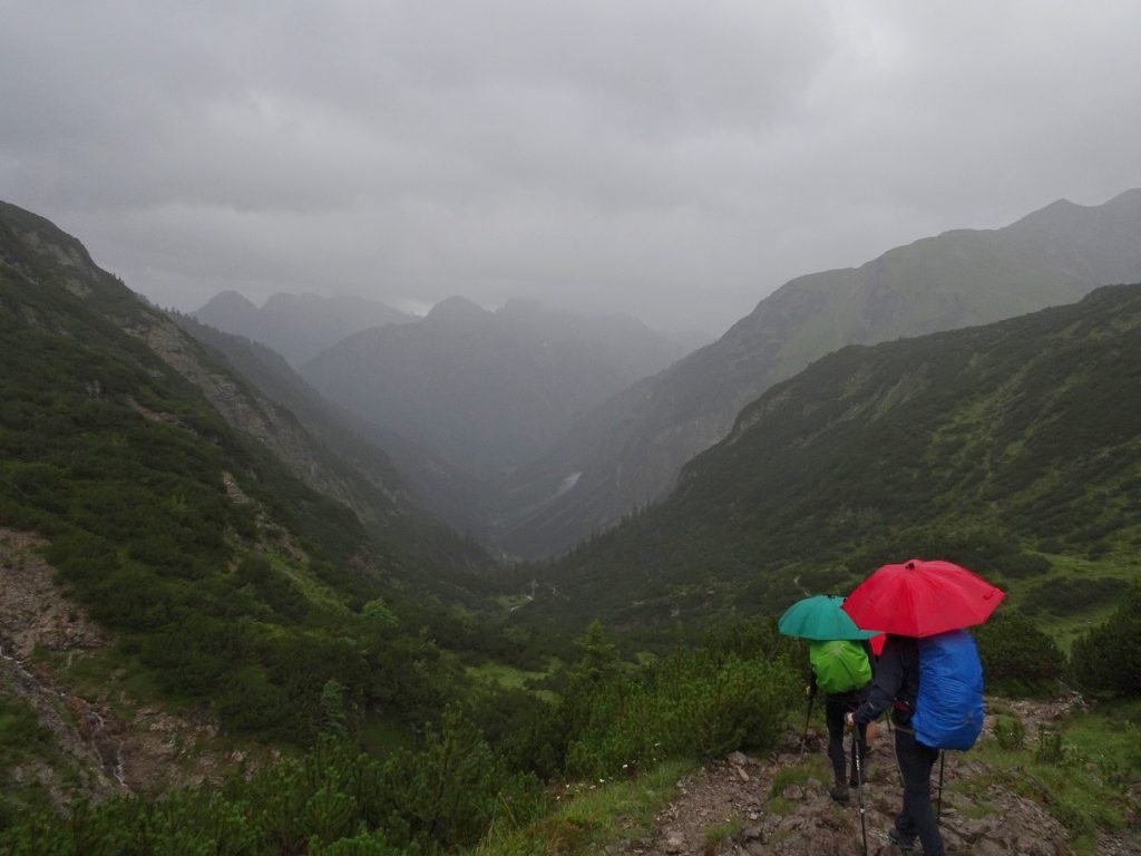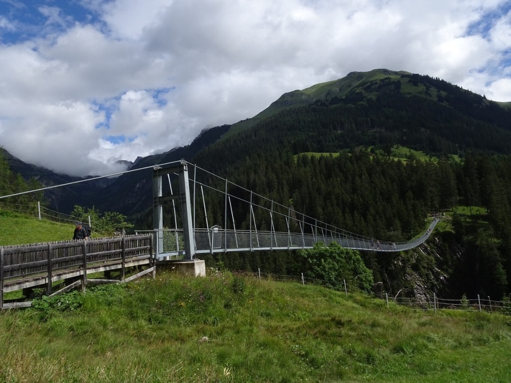 Nach dem Frühstück starteten wir um 07:40 auf unsere zweite Etappe von der Kemptener Hütte (1846m) zur Memminger Hütte. Der Weg führte zuerst ca. 130m hoch zum Mädelejoch (1973m). Hier befindet sich auch die Landesgrenze zwischen Deutschland und Österreich. Ab dem Mädelejoch begann der Abstieg bis nach Holzgau, der nur kurz durch eine Trinkpause auf der Roßgumpenalm unterbrochen wurde. Ein Highlight dieses Weges war sicherlich die Überschreitung der Hängebrück die die Höhenbachtalschlucht in einer Höhe von 110m überspannt und von der aus unser Zwischenziel schon zu sehen war. Gab es zu Beginn des Abstiegs noch ein paar Regentropfen, hellte sich der Himmel immer mehr auf und in Holzgau wurden wir nach über 800 Höhenmeter bergab und fast 04:30 mit blauem Himmel und strahlenden Sonnenschein empfangen. In Holzgau ging es dann zum Mittagessen in den Gasthof Bären wo wir uns für den Aufstieg zur Memminger Hütte am Nachmittag stärken konnten.
