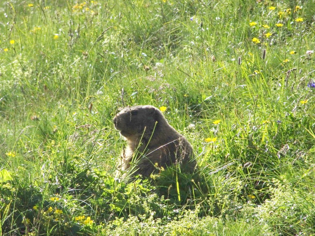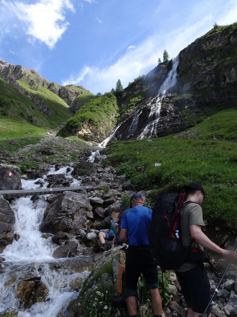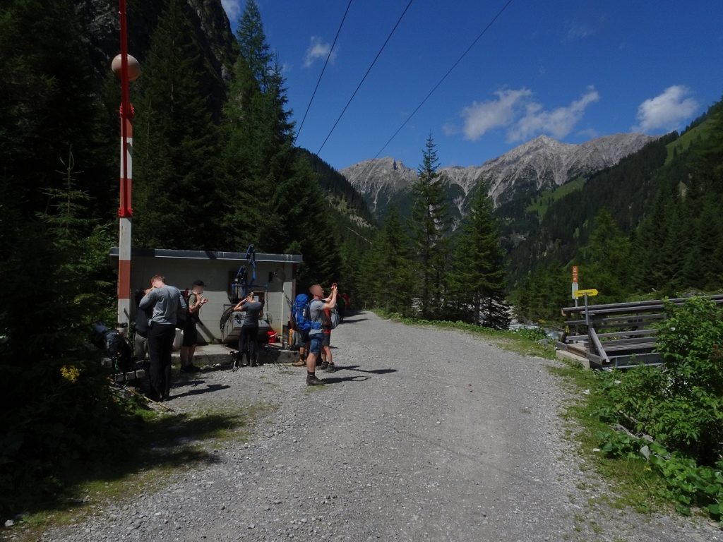 Nach dem Essen fuhren wir zuerst mit dem Bus durch das Madautal und dann von Madau durch das Parseiertal bis zum Parkplatz an der Talstation der Materialseilbahn zur Memminger Hütte. Von hier aus startete dann um 14:15 unser Aufstieg. An einem Wasserfall machten wir kurz Rast und nach einer Begegnung mit Murmeltieren erreichten wir nach fast 02:30 dann die Hütte auf 2242m.