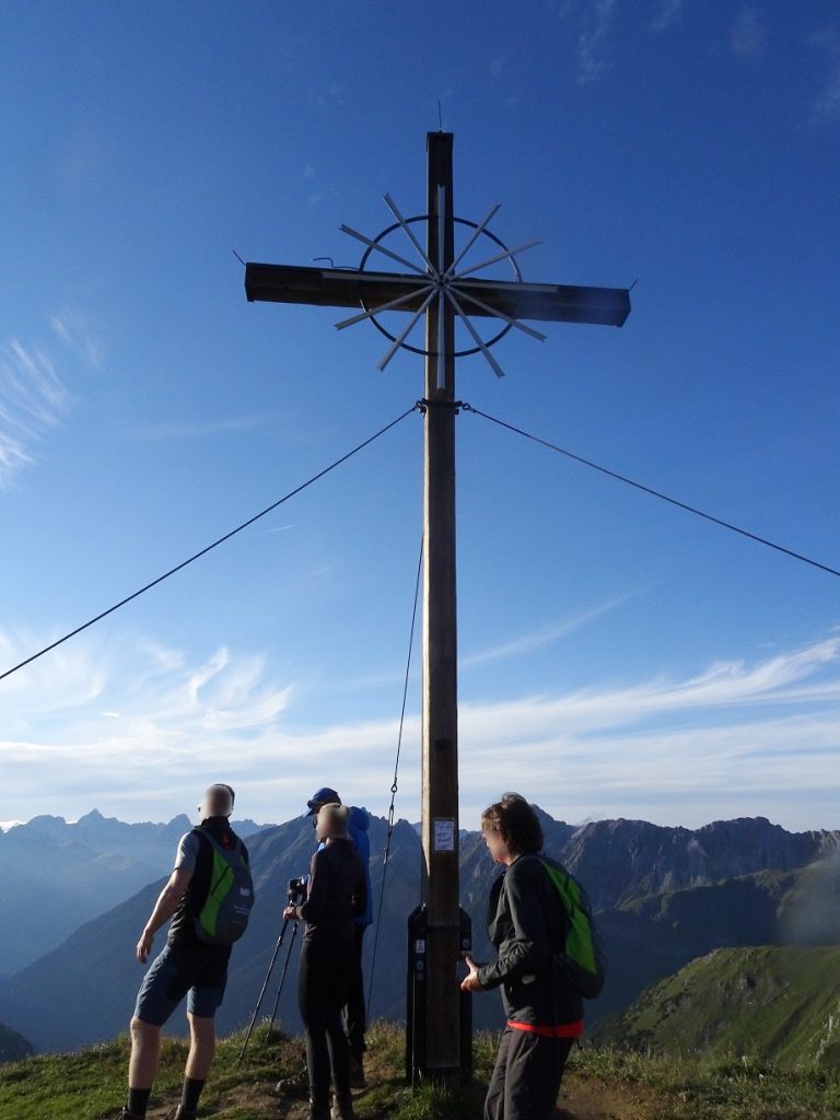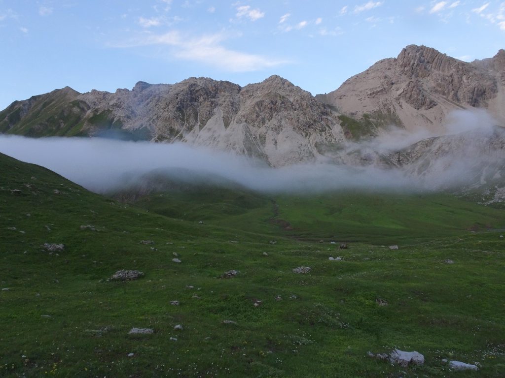 Zum Abschluß der sehr schönen zweiten Etappe machte sich eine kleine Gruppe noch auf zum Gipfel des Seekogels. Dieser liegt ca. 170m über der Memminger Hütte. Hier wurden wir mit einer schönen Aussicht für den 25-minütigen Aufstieg belohnt. Beim Abstieg durften wir noch Steinböcke beobachten und zusehen, wie die Wolken langsam über die Wiesen Richtung Hütte zogen.