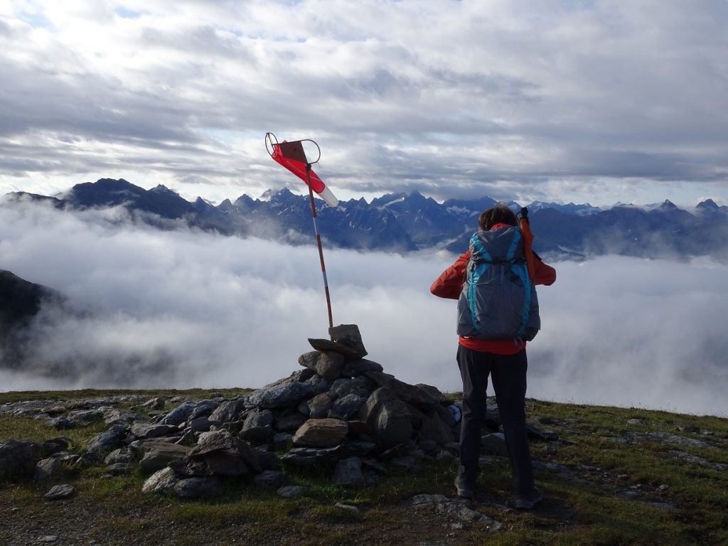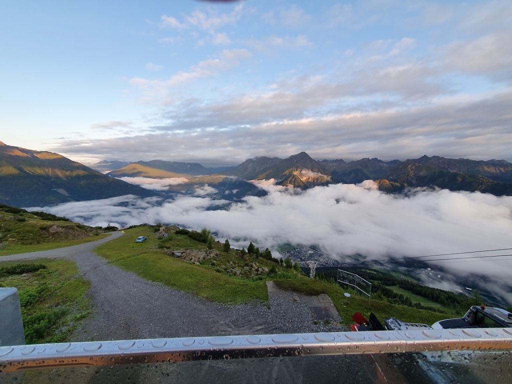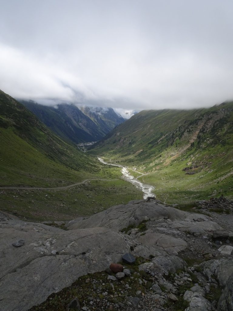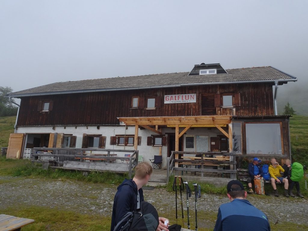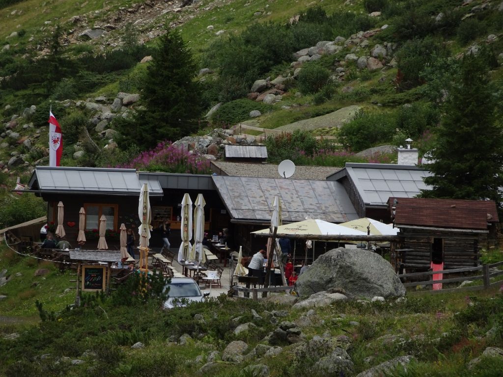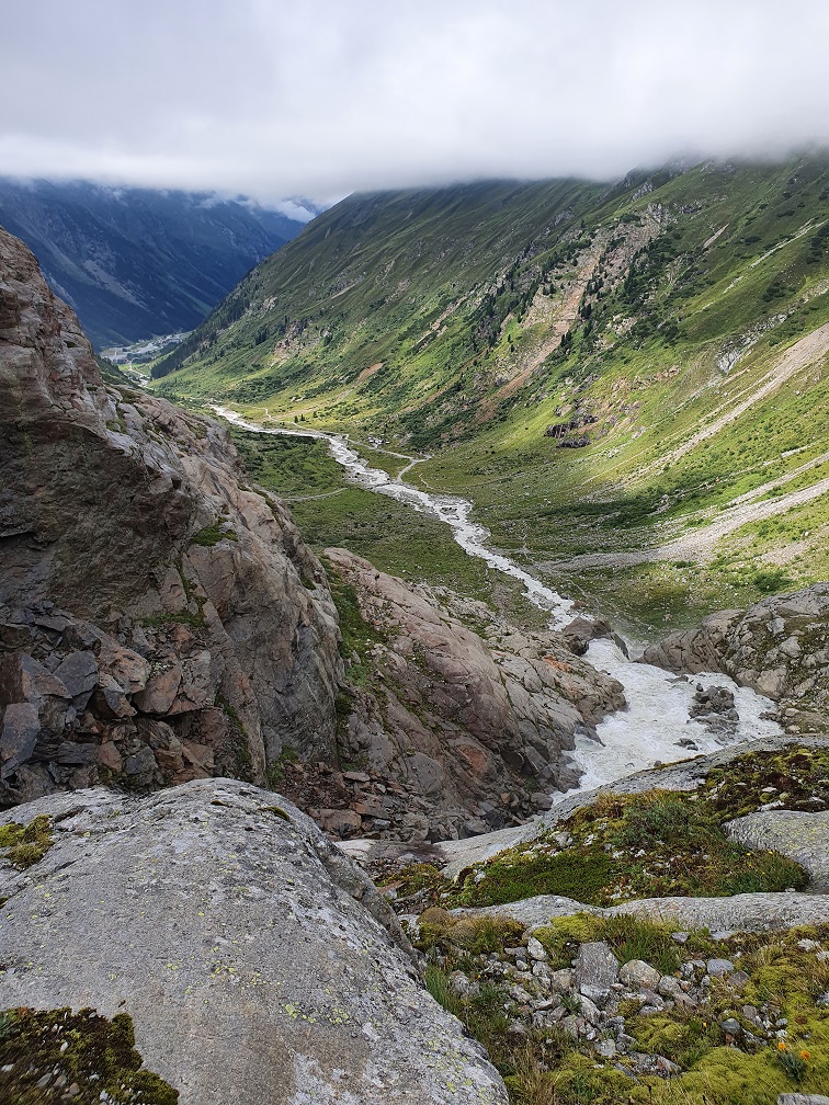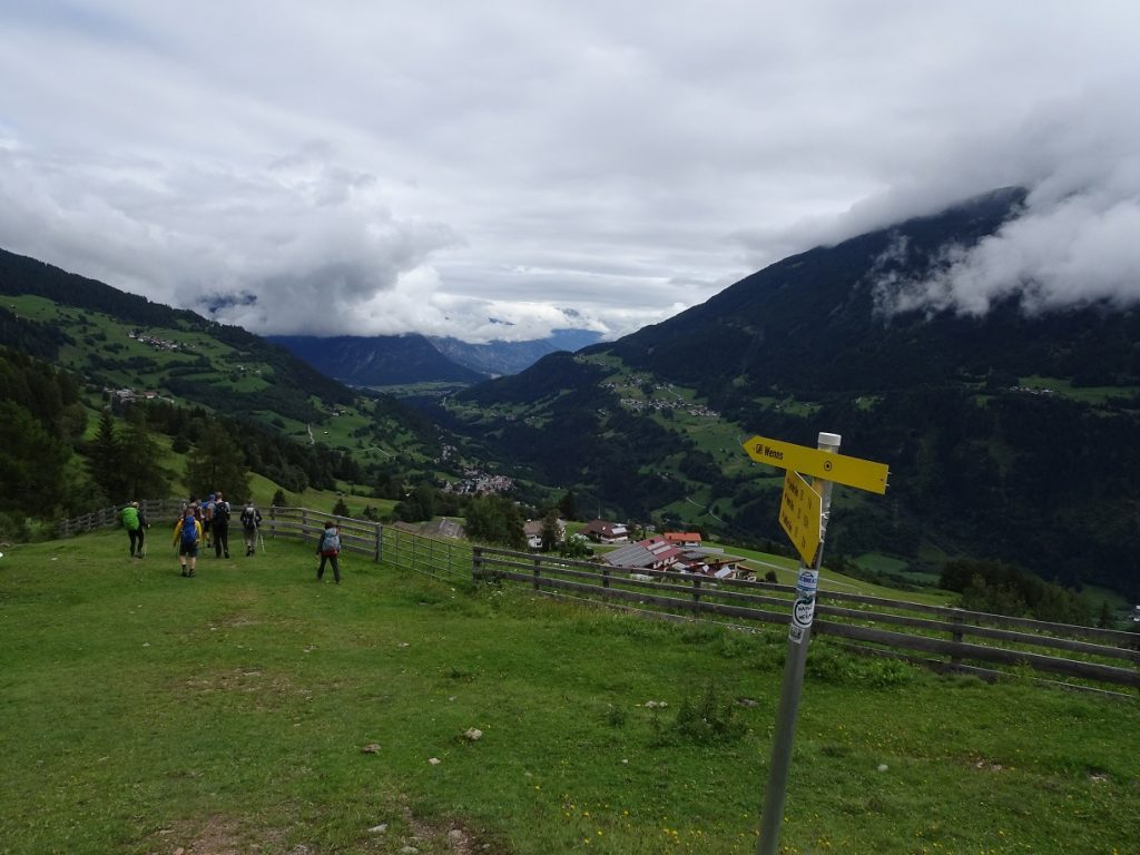 Gut gestärkt nach dem Frühstück geht es heute morgen um 08:00 auf die vierte Etappe unserer Alpenüberquerung. Im Tal unten liegen noch die Wolken während wir uns auf den Weg vom Krahberg (2212m) nach Wenns im Pitztal (982m) machen. Unser heutiges Etappenziel ist die Braunschweiger Hütte (2759m) am Ende des Pitztals. Der Weg nach Wenns ist panoramareich und der Abstieg bis zur Galflunalm ist kein Problem. An der Galflunalm machen wir eine kurze Pause bevor der etwas steilere Abstieg bis Wenns beginnt. Angekommen in Wenns warten wir an einer Bushaltestelle auf den Shuttle-Bus, der uns die 30km nach Mittelberg ans Ende des Pitztals bringen soll.