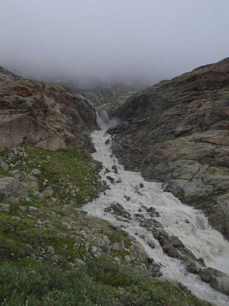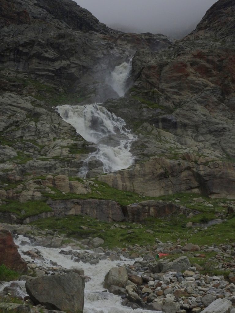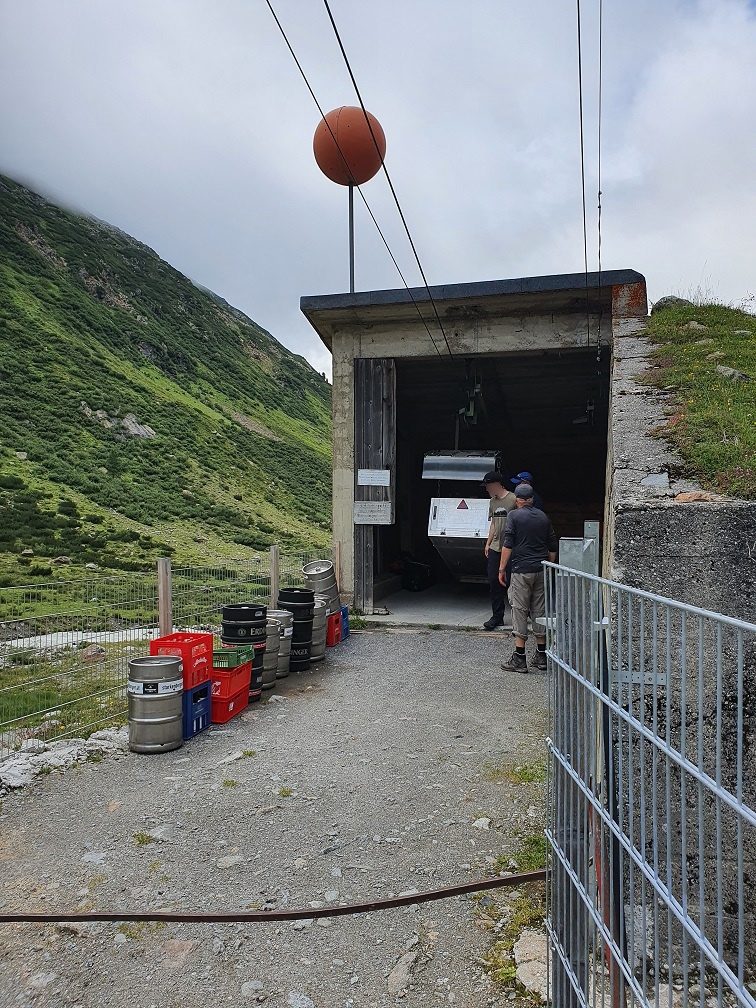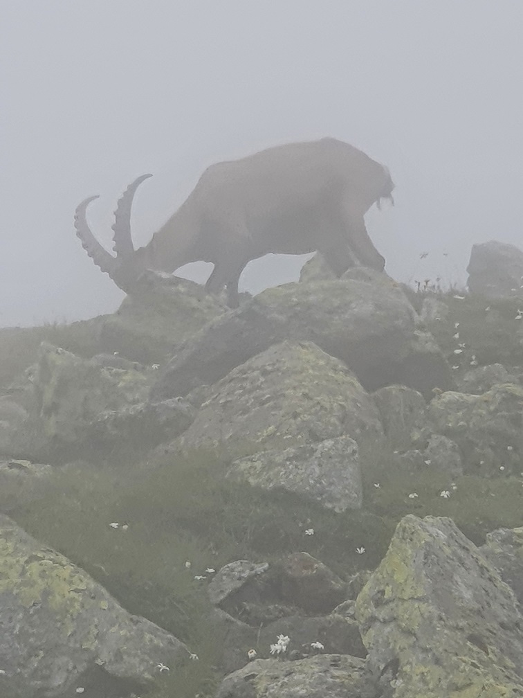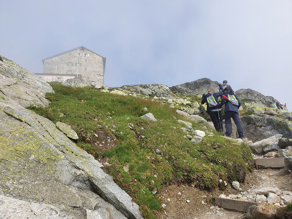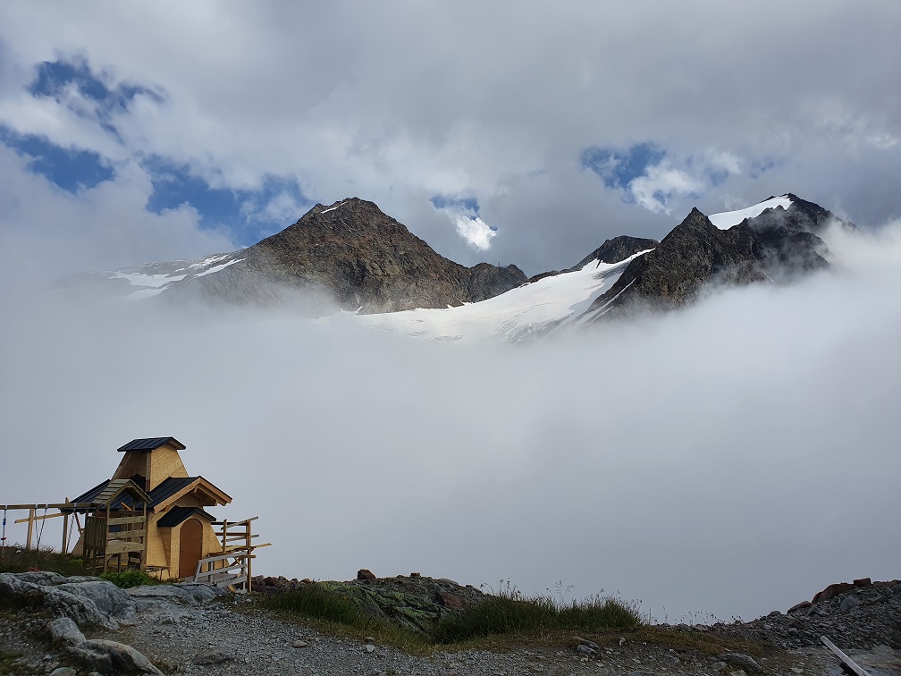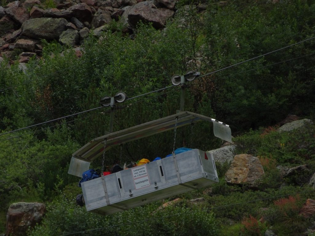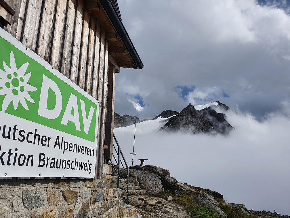 Von Mittelberg (1763m) laufen wir gemütlich in 45min bis zur Gletscherstube (1915m) und legen da erst mal eine Mittagspause ein. Nach dem Essen und der 45-minütigen Pause können wir unsere Rucksäcke an der Materialseilbahn der Braunschweiger Hütte abgeben und brauchen nur das Nötigste in den Leichtrucksack (Geschenk vom Oase-AlpinCenter) zu packen. Damit wird der Aufstieg mit über 800 Höhenmetern zur Hütte erleichtert. Der Weg führt vorbei an dem wohl am häufigsten fotografierten Stein mit den Schriftzug „E5“, steil bergauf neben einem Wasserfall und dann einer breiten Skipiste entlang. Leider verhüllten Wolken das Bergpanorama, sodaß uns der Blick auf die Gletscherwelt verborgen blieb. Dafür stand aber plötzlich ein Steinbock in unserer unmittelbaren Nähe. Nach 2 Stunden und 15 Minuten erreichten wir dann die Braunschweiger Hütte.