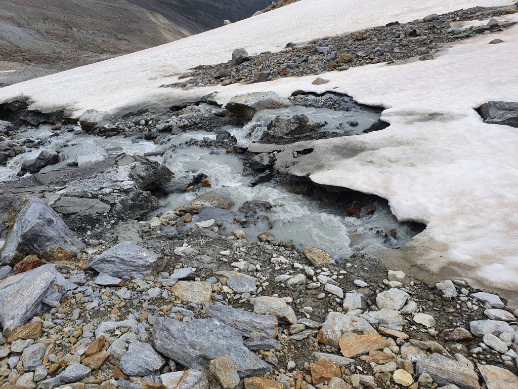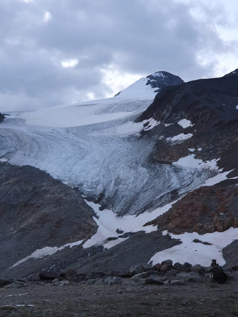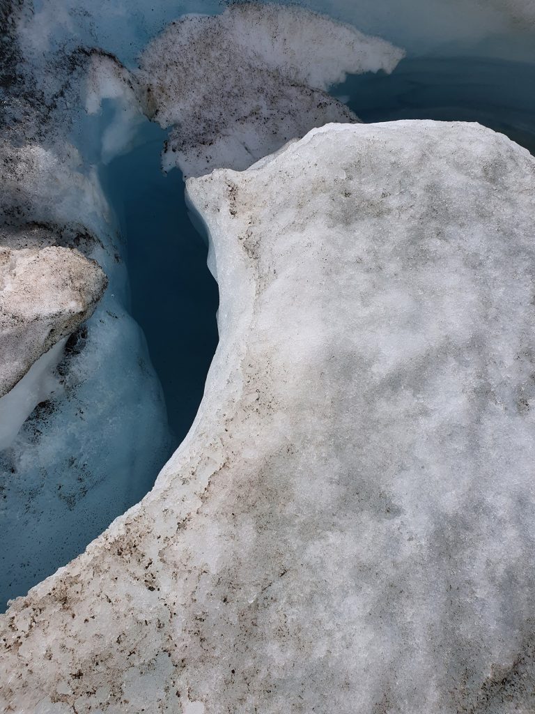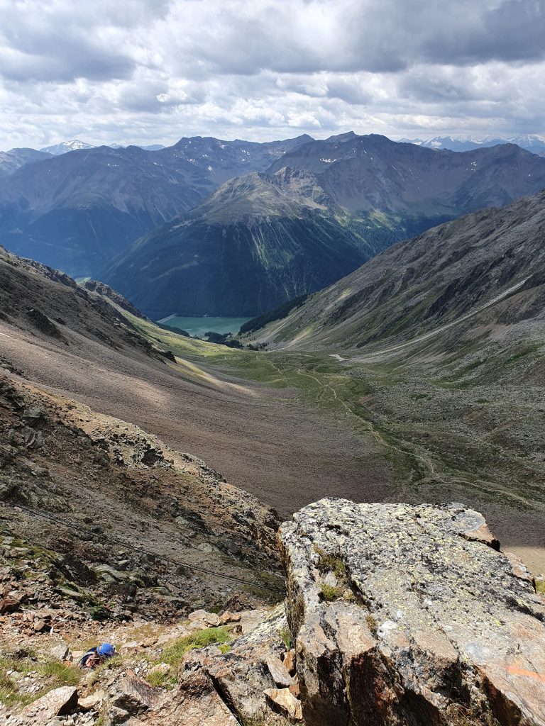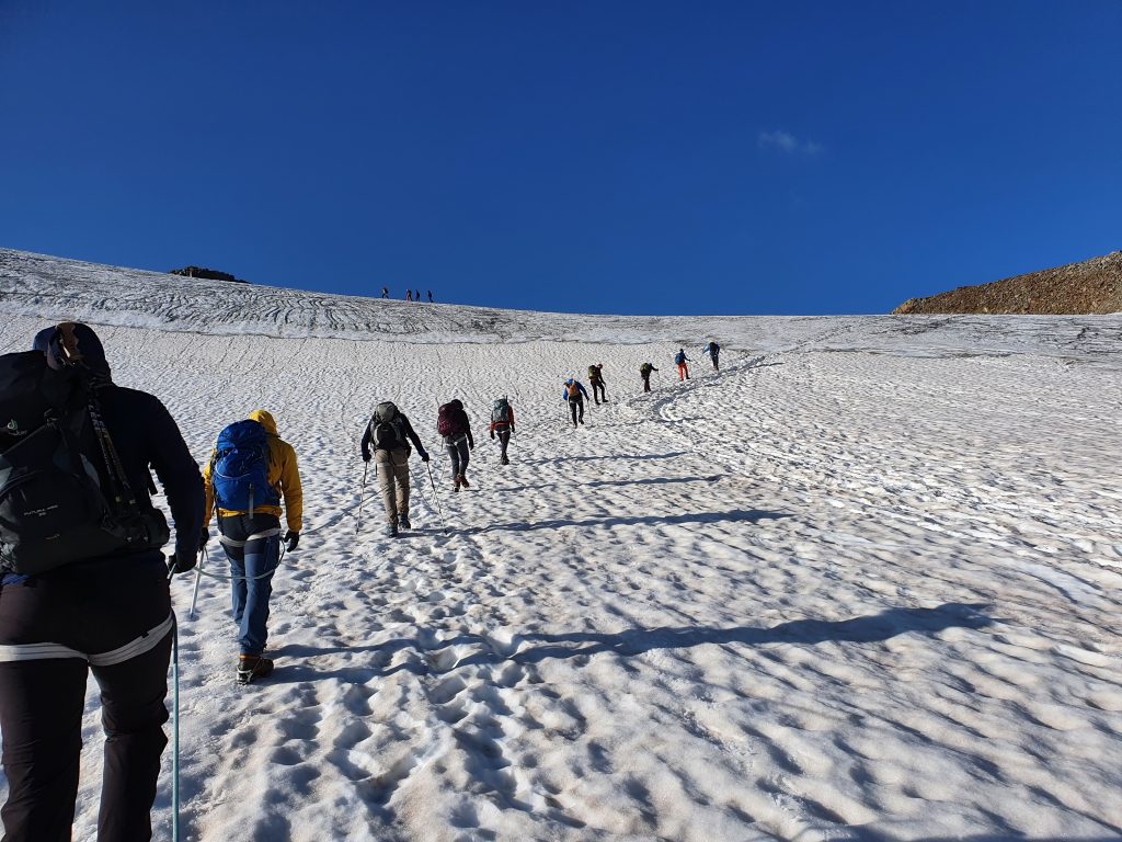 Nach kurzem Aufenthalt auf dem Gipfel und einem Eintrag ins Gipfelbuch traten wir wieder den Rückweg zur Similaun-Hütte an. Der Weg über den Gletscher verlief abwärts etwas anders als beim Aufstieg und so kamen wir immer wieder an Spalten vorbei in denen das Gleterwasser rauschte und in allen Blautönen schimmerte. Als wir in der Hütte ankamen war erst mal Mittagspause angesagt. Nach der Stärkung haben wir unsere Rucksäcke gepackt und sind zum letzten Teil dieser Alpenüberquerung aufgebrochen.