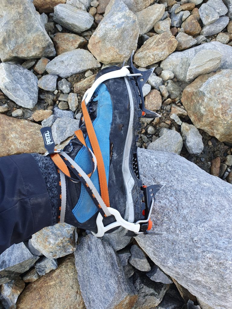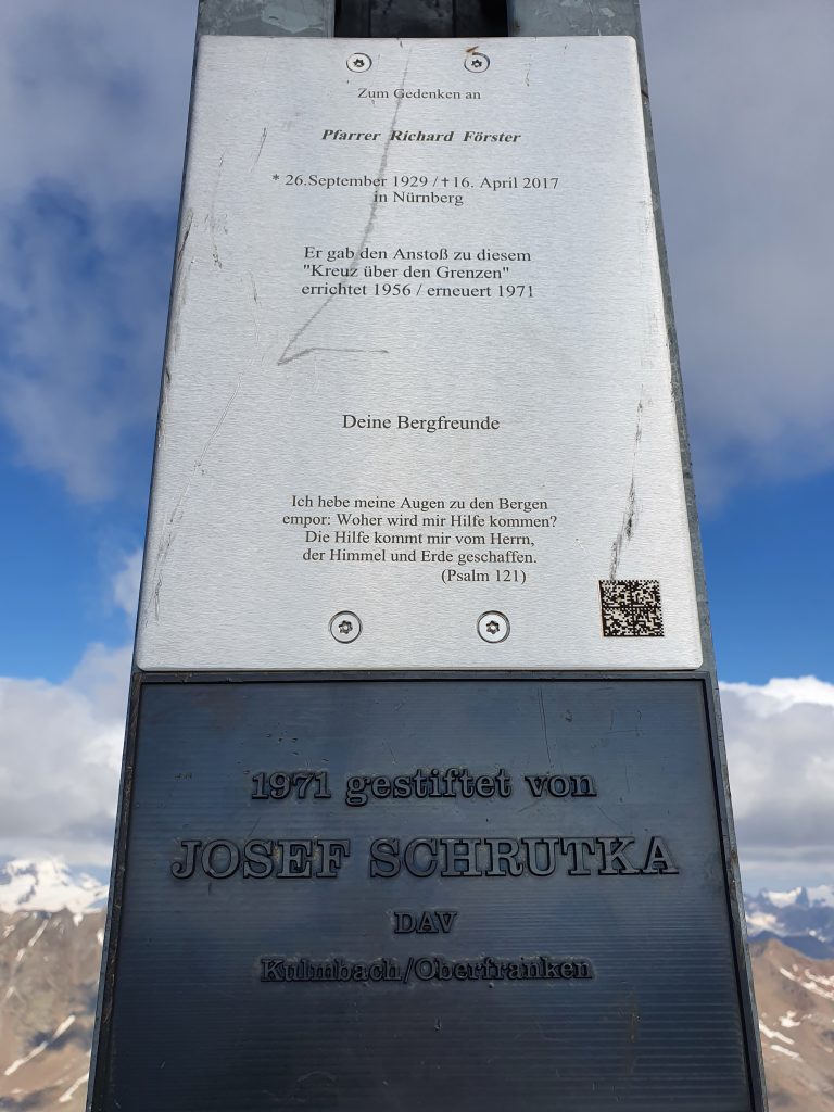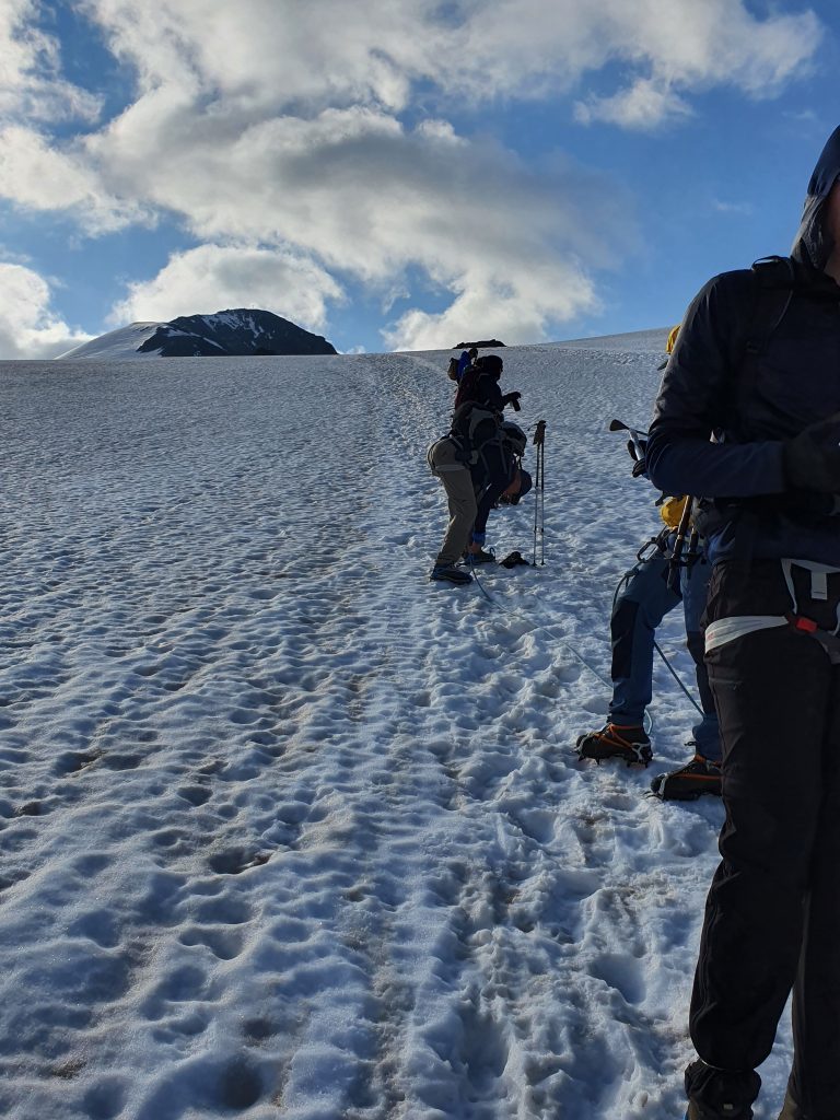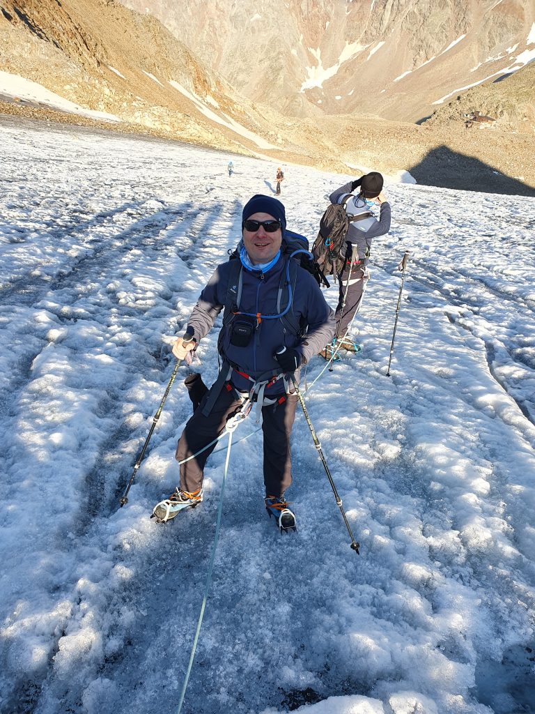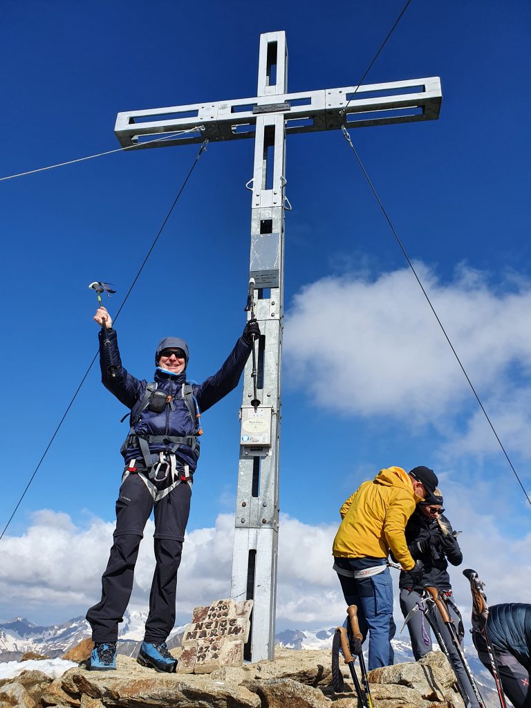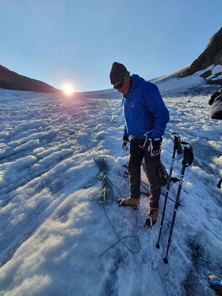 Heute war früh aufstehen angesagt. Bereits um 07:00 machten wir uns auf den Weg von der Similaun-Hütte (3019m) zum Gipfel des Similaun (3606m). Das Wetter war herrlich für diese Hochtour. Erst waren noch viele Wolken am Himmel, die sich aber schnell verzogen und wir auf unserm Weg strahlenden Sonnenschein hatten. Unsere Rucksäcke hatten wir bis auf das Wichtigste ausgeleert und die Sachen in der Similaunhütte zurückgelassen. Eingepackt hatten wir statt dessen Steigeisen, die wir bereits am Abend vorher leihweise bekamen und zum ersten mal für Trainingszwecke angelegt hatten. Außerdem wurde uns noch ein Klettergurt ausgehändigt den wir ebenfalls mit in den Rucksack packten.Nach ca. 20min über Gestein und Schnee war es dann auch soweit, daß die Steigeisen zum Einsatz kamen. Auch den Klettergurt haben wir angezogen und wurden dann von unserem Bergführer an die „Leine“ genommen. Jetzt ging es auf das Eis des Niederjochferners. Schön hintereinander ging es dann bei einer herrlichen Aussicht langsam über den Gletscher dem Gipfel entgegen. Nach ca. 01:30 war der Gletscher überquert und wir konnten die Steigeisen wieder im Rucksack verstauen. Die letzten Meter bis zum Gipfel legten wir dann ohne Steigeisen zurück und ca. 30min später war der höchste Punkt unserer Wanderung erreicht.