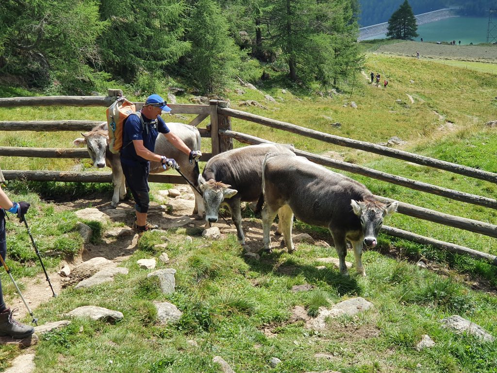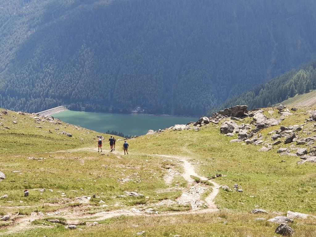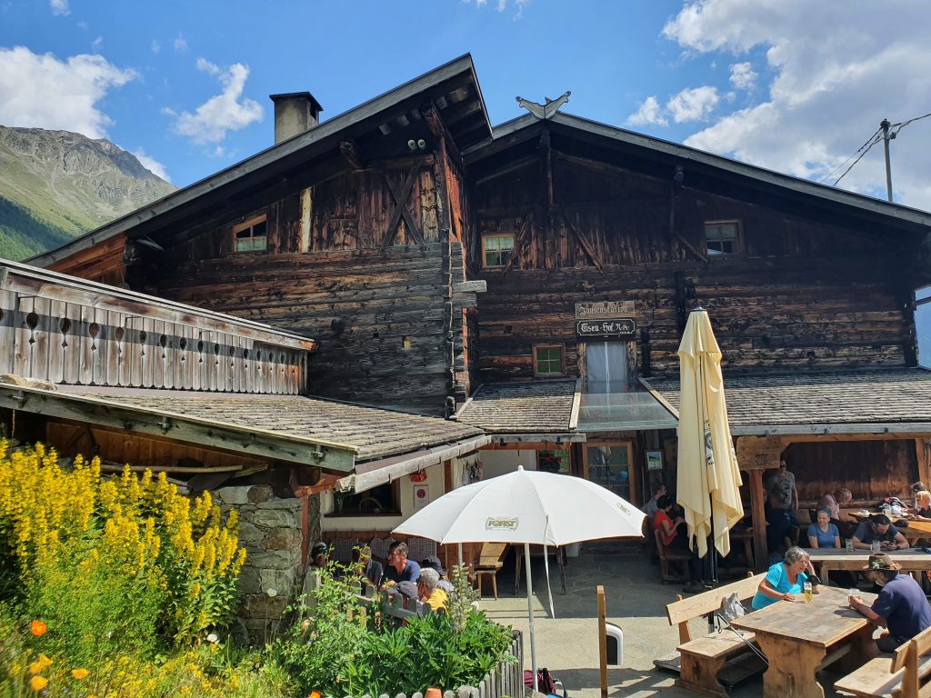 Der Weg führte ca. 1200m abwärts bis zum Tisenhof (1814m) in Vernagt. Der Abstieg war problemlos bis uns Kühe den Durchgang an einem Gatter verwährt hatten. Nach guten Zureden und ein paar Klapse auf den Hintern machten sie aber dann den Weg frei und wir erreichten nach zwei Stunden den Tisenhof. Hier gab es eine kleine Brotzeit. Mit Rotwein haben wir auf unsere gelungene Alpenüberquerung angstoßen und waren einerseits glücklich, daß wir das alle geschafft hatten, aber auch ein bischen traurig weil die schöne Woche jetzt dem Ende entgegen ging.